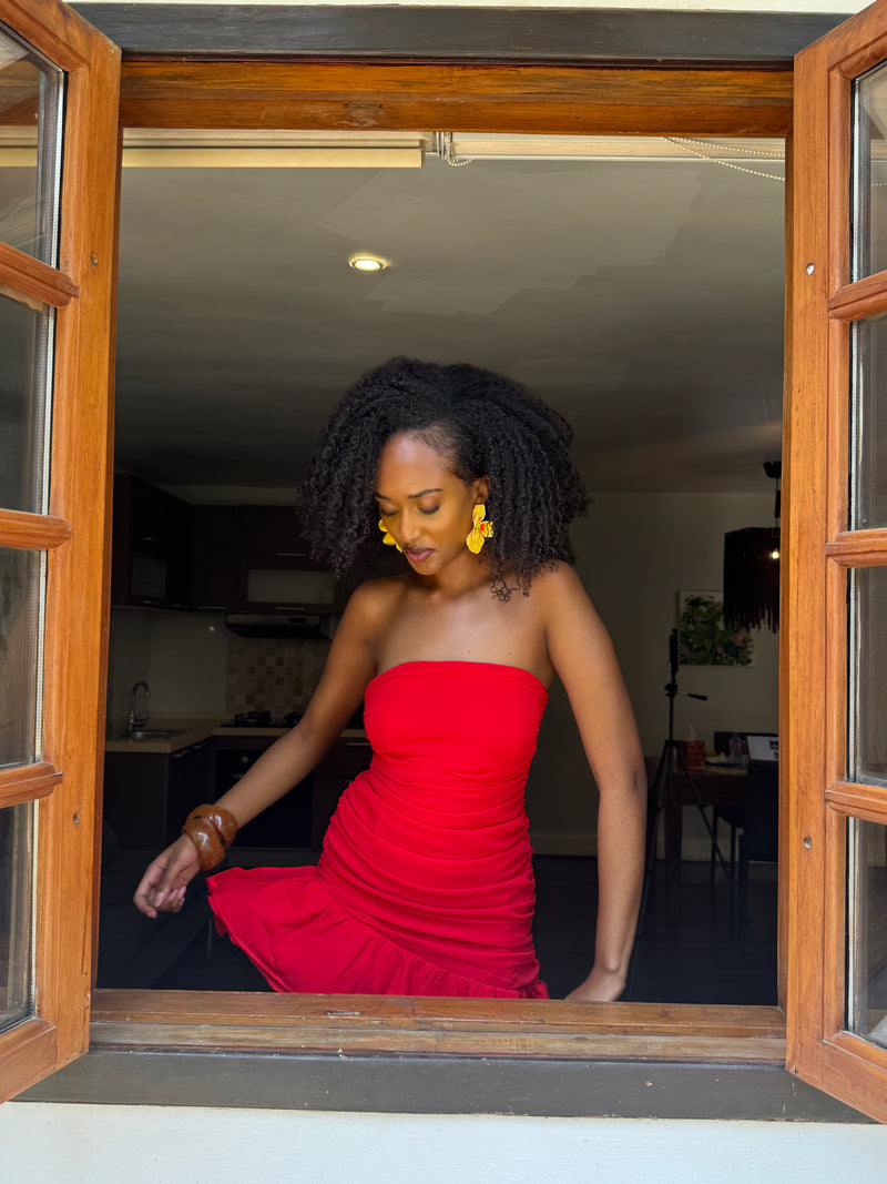 Alana 4 novemberVerified reviewI love the bold, powerful red color.This dress is such a confidence booster. The ruching on the sides hugs my waist perfectly, and the ruffled hem moves so beautifully when I walk. I love the bold, powerful red color.